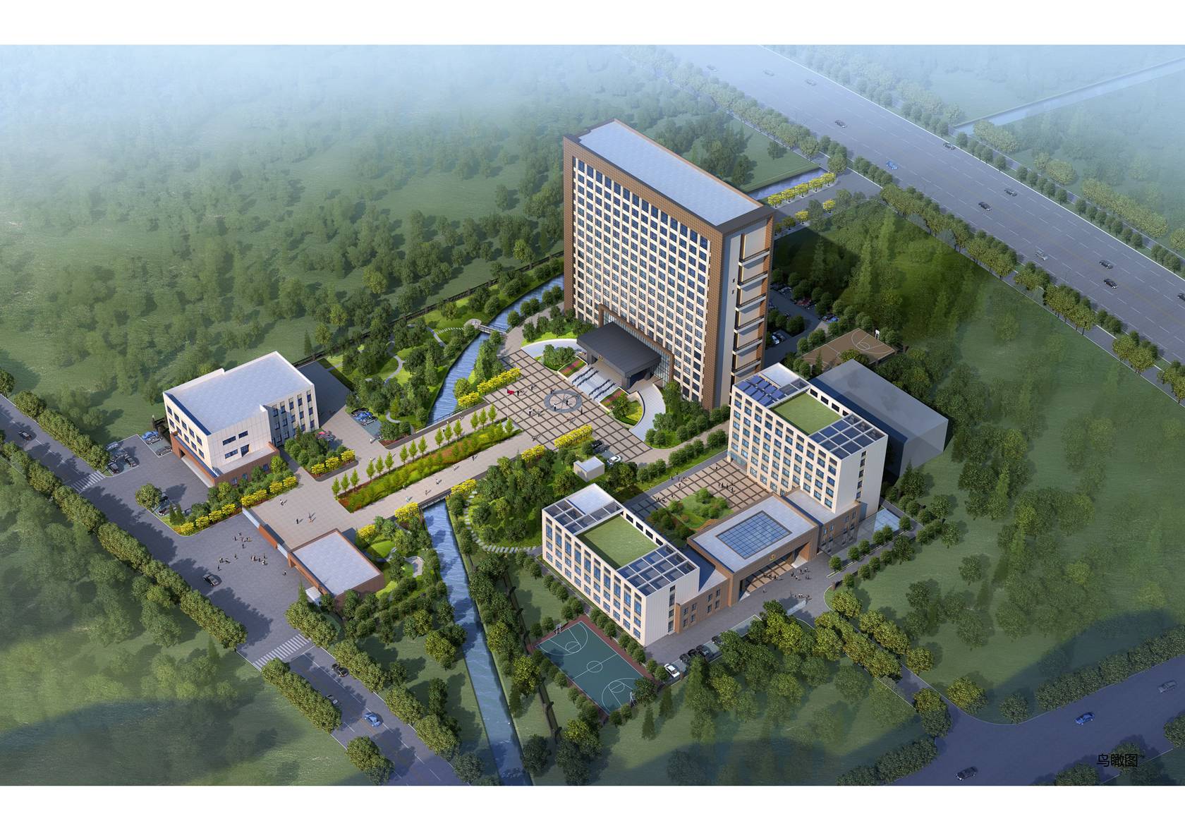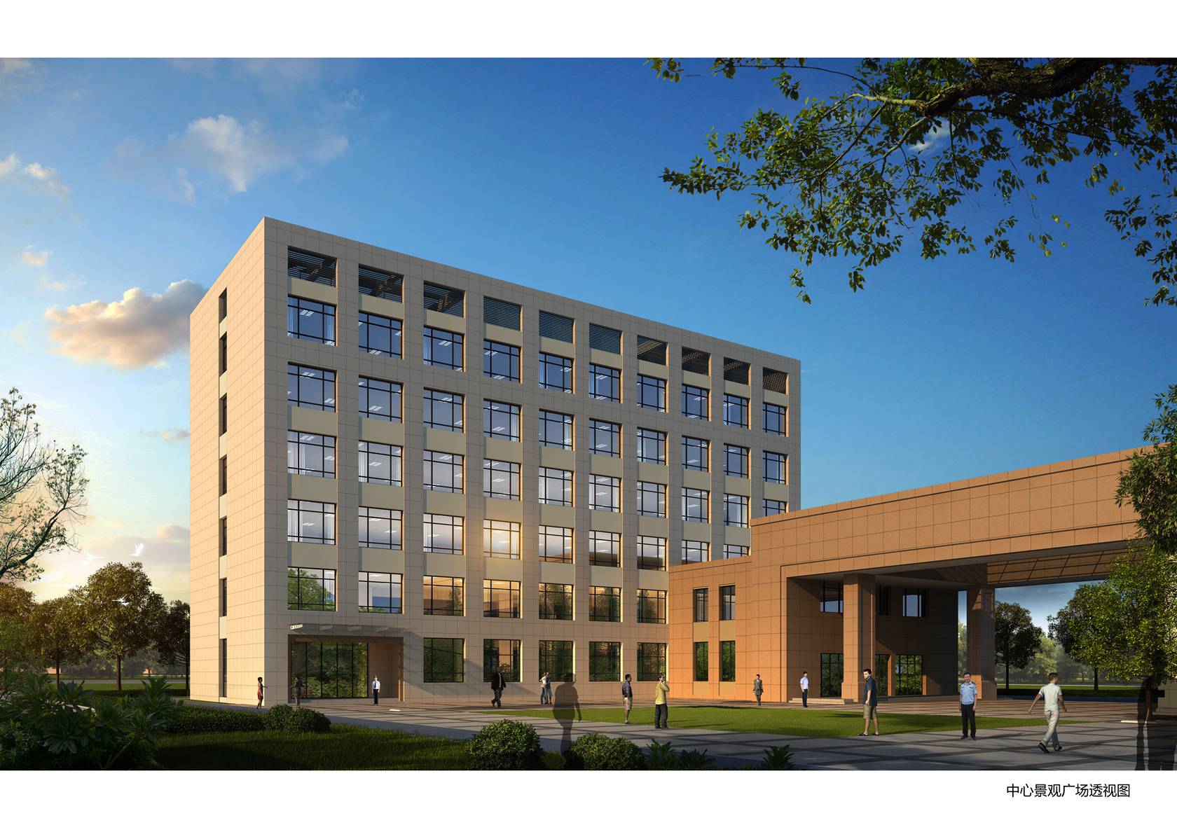 本案采用传统的院落布局,两栋南北向平行的主体建筑及一栋东西向裙房建筑围合而成大面积的半开放空间,既是中心景观广场又可作为平时室外训练场地使用;使用功能相似或有内在联系的建筑相对集中布置,用门廊加以联系,形成相互关联的群体结构。