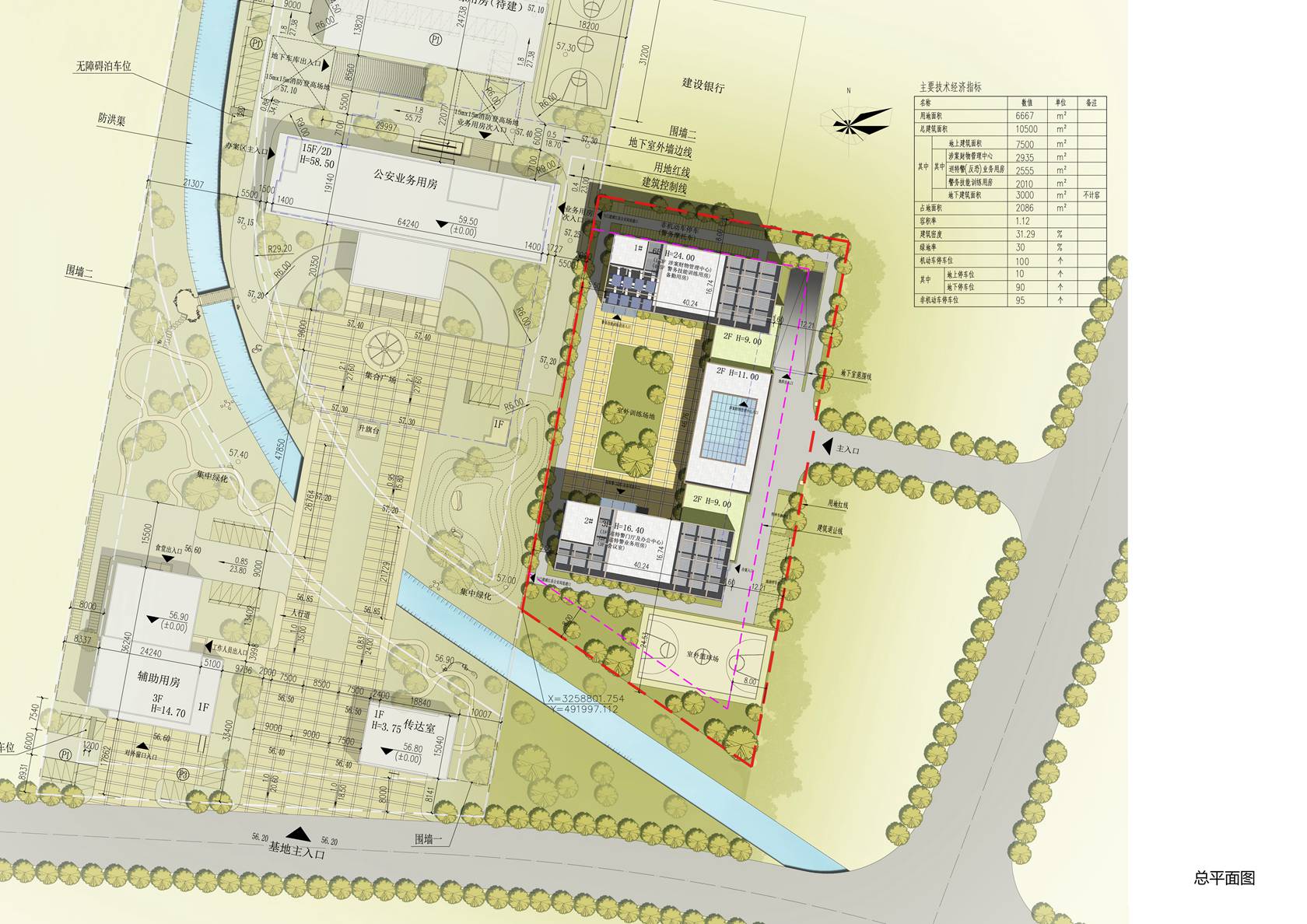 浦江县刑事诉讼涉案财物管理中心及公安局巡特警(反恐)业务用房建设工程设计项目位于浦江县恒昌大道南侧,蒋村农居点以西,公安大楼以东,建设银行以南地块。建设规模为用地面积6667平方米,总建筑面积10500平方米,其中地上建筑面积7500平方米,地下建筑面积3000平方米,容积率为1.12,建筑密度31.29%。
