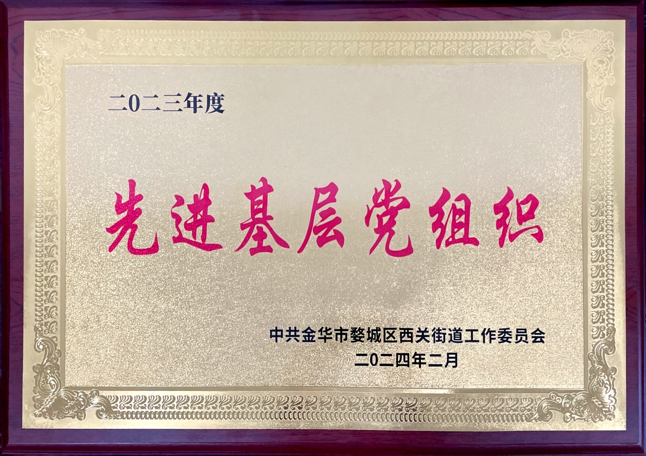 中共金华市婺城区西关街道工作委员会授予的先进基层党组织荣誉。